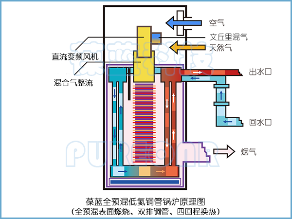 1、葆藍(lán)超低氮純銅鍋爐換熱部分采用翅片純銅管,出廠前20公斤打壓試驗(yàn)。
